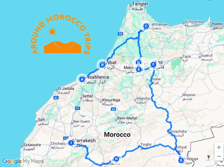 Map of the 10 days Casablanca to Marrakech Moroccan adventure