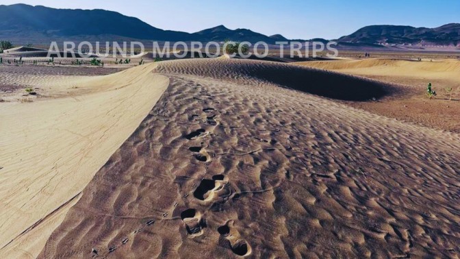 Our 2-day Marrakech to Zagora Desert tour will start from your Riad or hotel in Marrakech. First, we cross the High Atlas Mountains, heading to Ait Benhaddou for a historical visit. Then, we pass by Ouarzazate, known as the Hollywood of Africa. Next, we continue to the Draa Valley, where we’ll stop at a beautiful panoramic viewpoint overlooking the vast valley of palm trees. After passing through Tansikhte, we’ll reach Zagora before sunset. There, you’ll enjoy a fantastic camel trek across the dunes and spend the night under the stars, with dinner and music included.