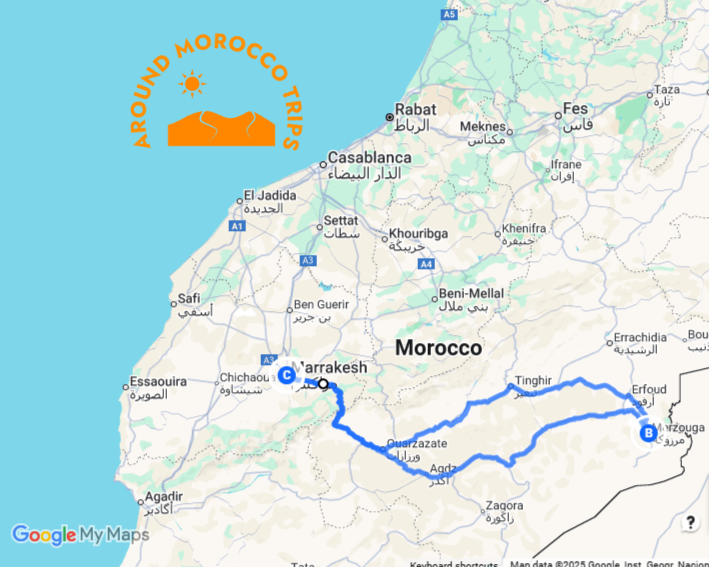 Map: Here is a visual itinerary of the 2 days tour from Marrakech to Merzouga sahara
