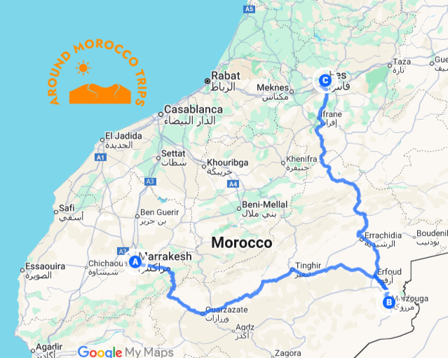 Map: Here's an itinerary of 2 days tour Marrakech to Fes and Merzouga Erg Chebbi