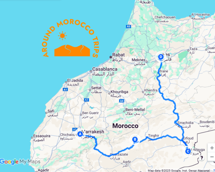 Map: Visual trail of the 3 days marrakech to Fes Morocco trip