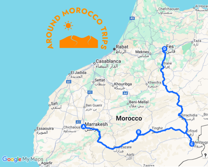 Map: This is a Visual google Map trail of the 4 Days Desert trip Marrakech to Fes