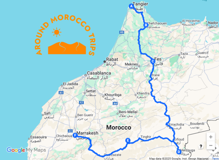 Map: Here is a visual trail of the 4 days tour Tangier to Marrakech Morocco