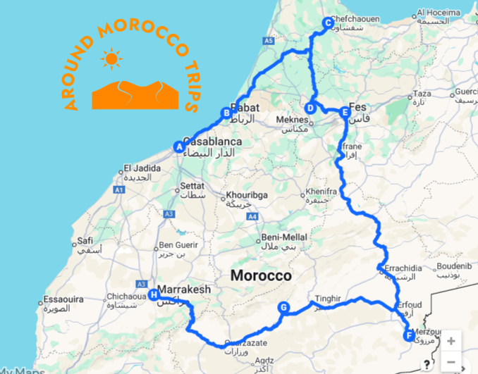 Map of the 8-Day Journey Across Morocco: From Casablanca to Marrakech