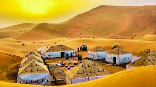 After breakfast, explore Dades Valley before heading to Todra Gorge for a short walk between high cliffs. Then, pass through Erfoud and Rissani en route to Merzouga. Upon arrival, enjoy a camel trek across the dunes of Erg Chebbi. End the day with a sunset, followed by dinner and music at a desert camp.